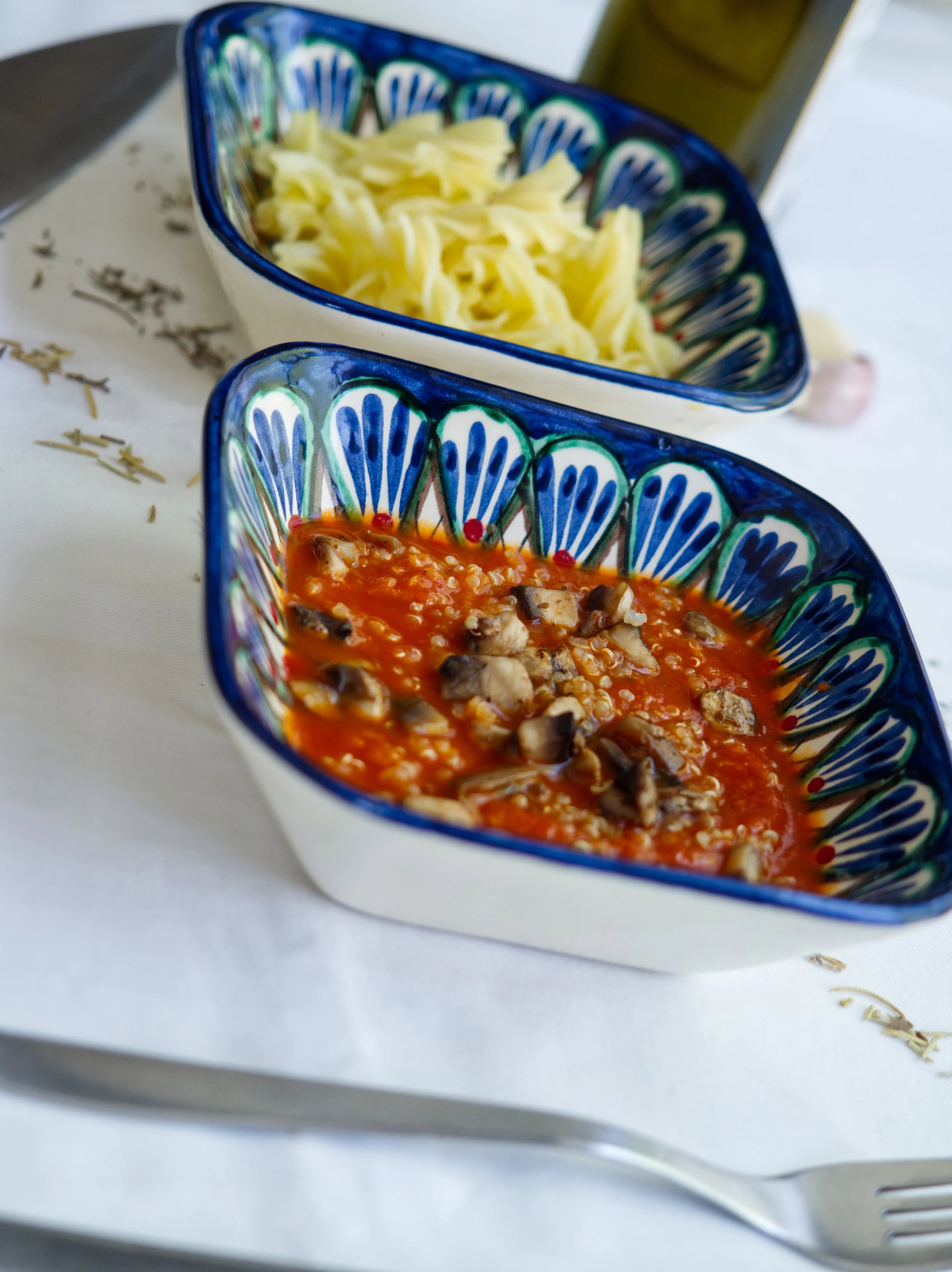 Pasta, mushrooms and quinoa in a tomato sauce.